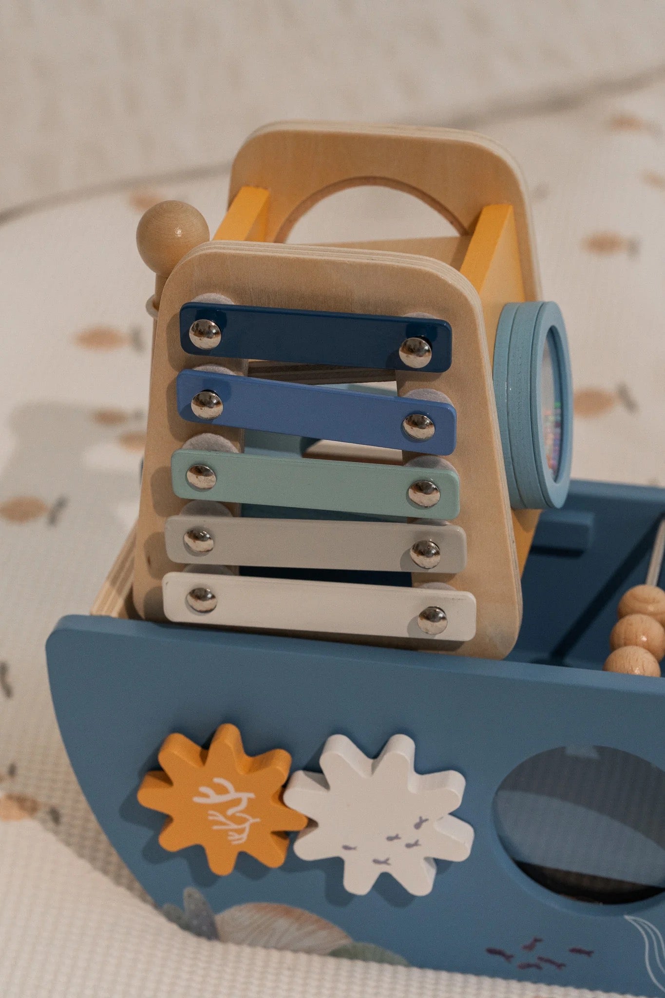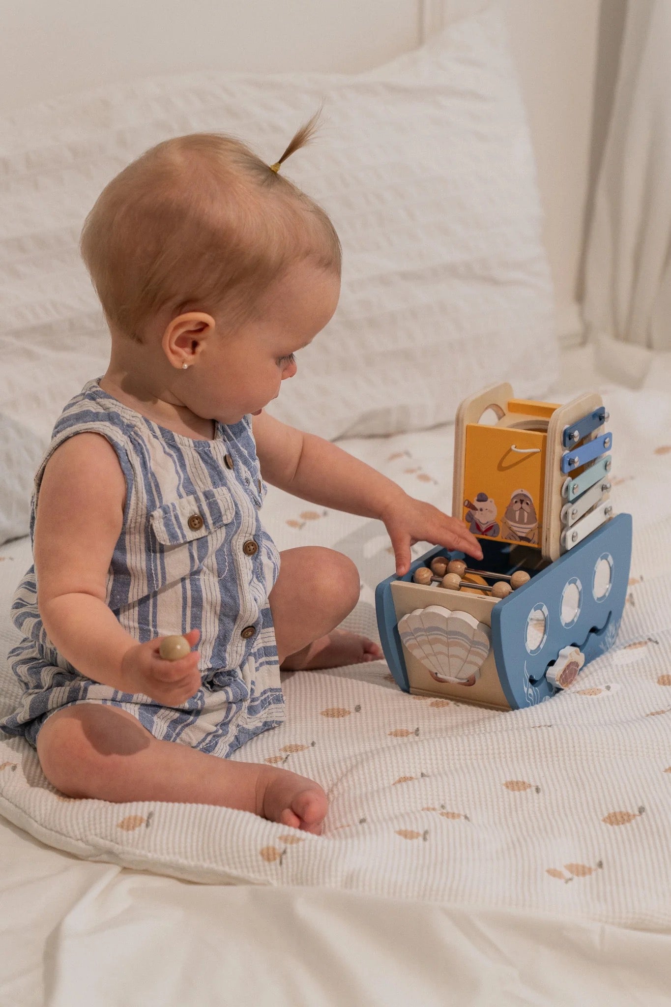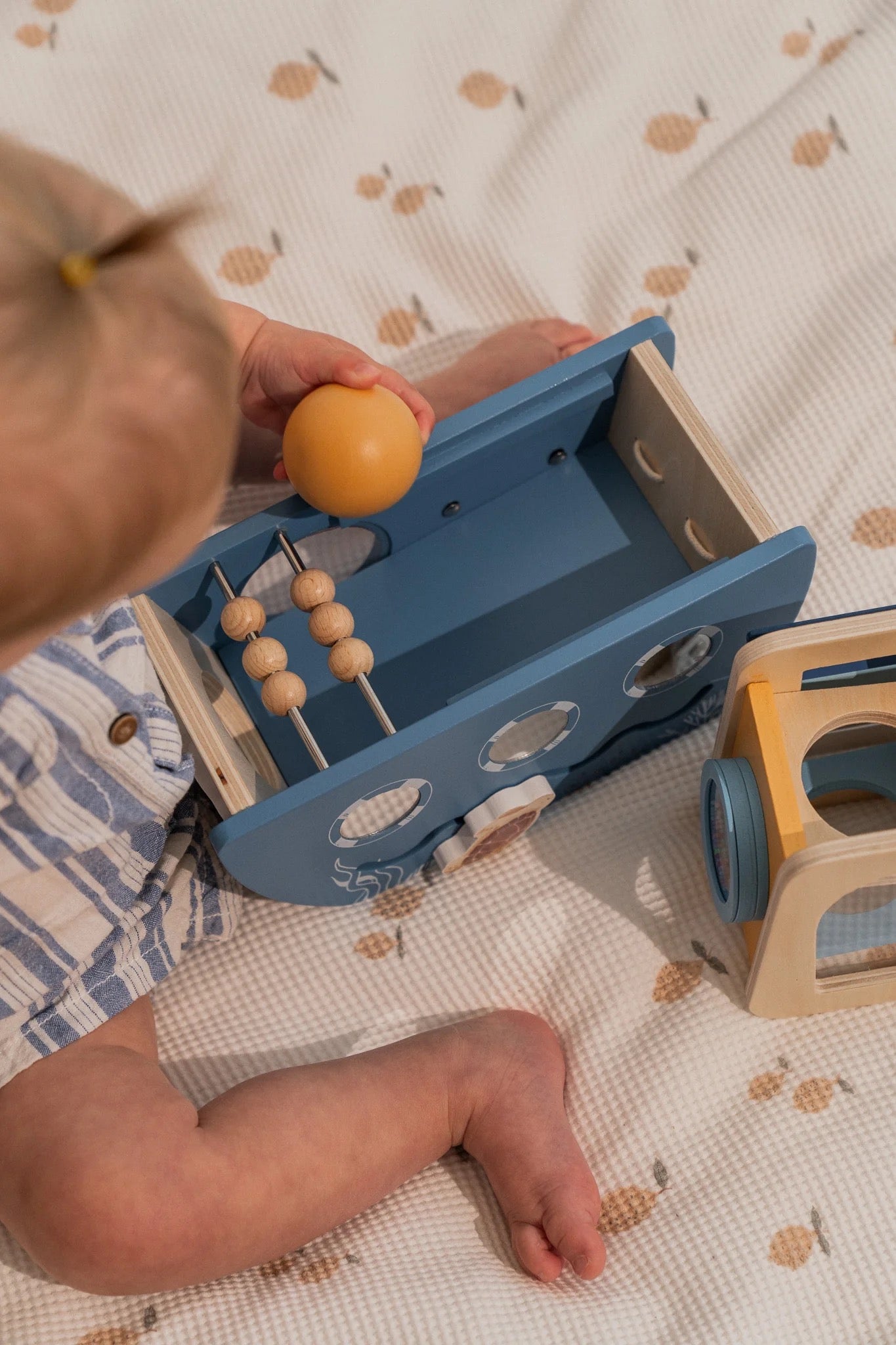 Jouet d'éveil en bois dès que bébé se mets en position assise.