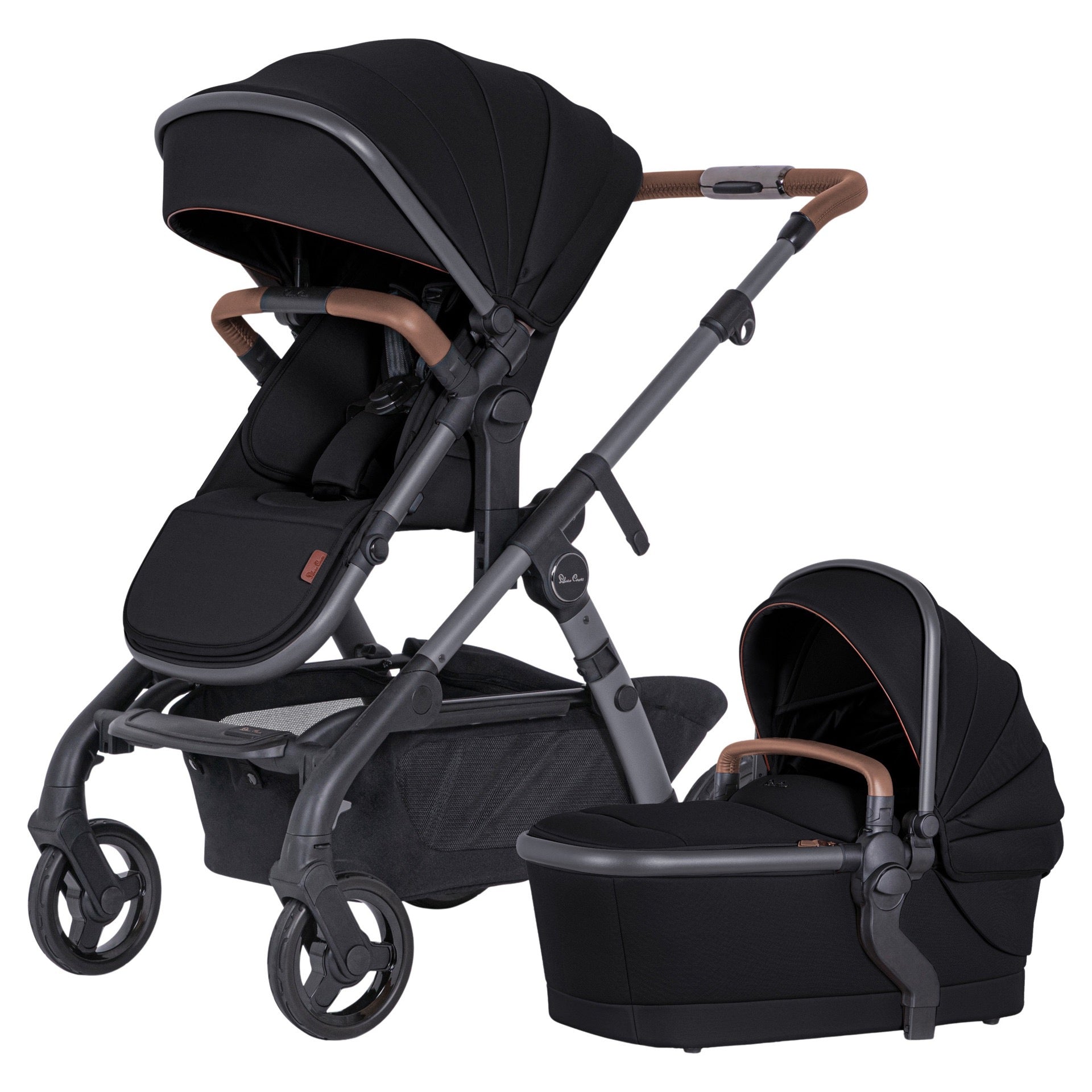 The bassinet faces you and the tandem seat faces the world. Dreamy strolls. The included bassinet can serve as your first bed, as it's designed for baby to spend the night in. Comfortable and secure, it allows you to go out with baby all day with peace of mind. It features a rigid base and is equipped with ventilation holes and a cover made of antibacterial and hypoallergenic bamboo fiber, soft as a cloud. Equipped with a magnetic buckle and a backpack-style adjuster, the Genius harness keeps your child safe without compromising their comfort. Fabrics and metal details that reflect the luxury of the Wave 3 stroller and its meticulous construction. Smooth ride. Equipped with puncture-proof all-terrain tires and independent four-wheel suspension, the Wave 3 offers a very smooth ride even on uneven terrain. Full-size, ventilated canopy with SPF 50+, pop-up sun visor and peep-through windows. Patented seat elevator. The Wave 3 features a patented seat elevator that allows you to raise the seat to get closer to your baby. A strong, durable aluminum alloy frame provides easy maneuverability. The Wave stroller features a telescopic handle that can be adjusted to five heights, so you can easily find the one that's right for you. Personalize your Wave 3 stroller with a variety of accessories (sold separately) designed for you and your baby.