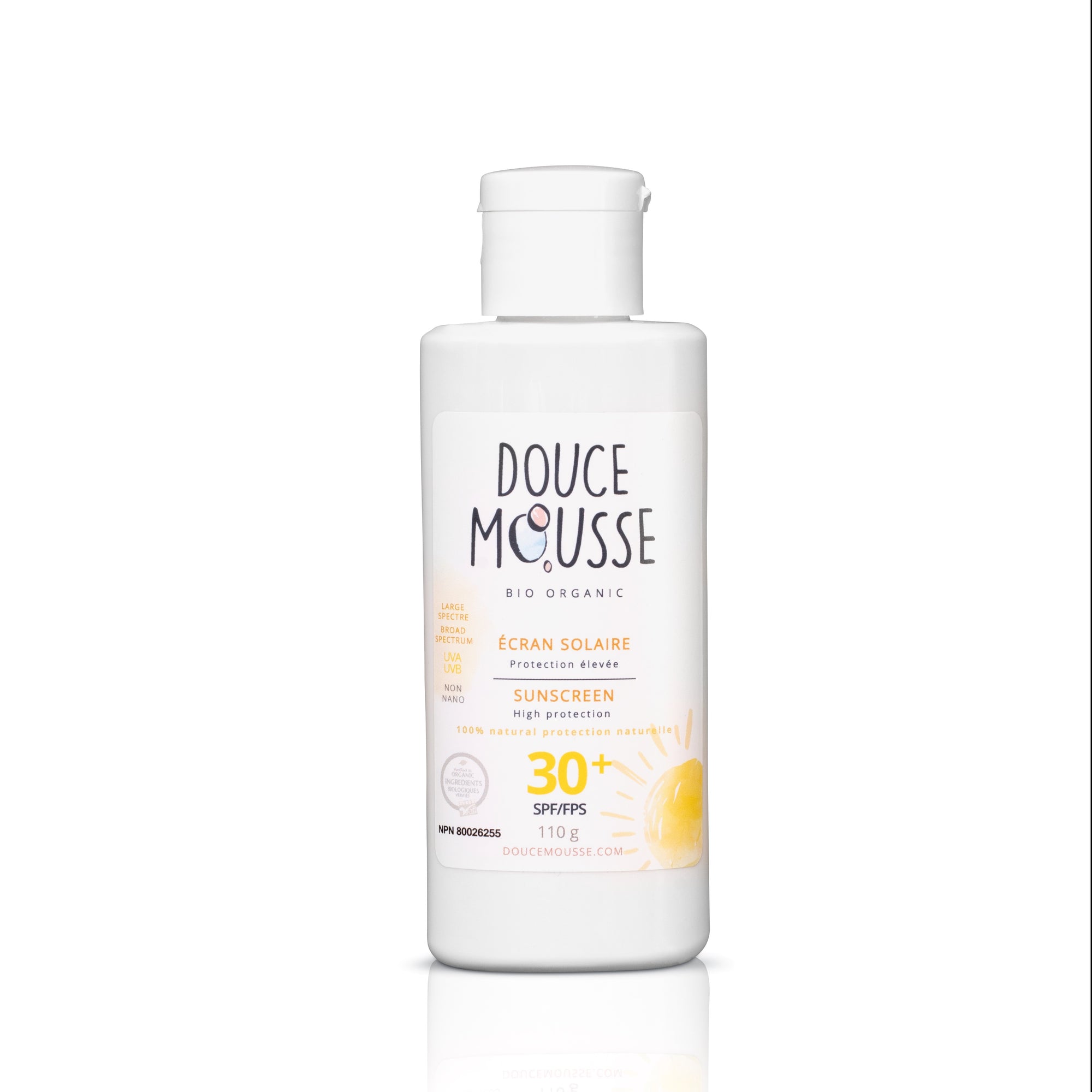 Tous les ingrédients de l’écran solaire Douce Mousse MD rencontrent les normes les plus sévères en matière de formulation naturelle et biologique. (sans pesticides, renouvelable et biodégradable) Ingrédient principaux: Huile de jojoba biologique: L’un des ingrédients préférés des peuples Aztèques, l’huile de jojoba est hydratante et humectante et convient aux peaux les plus sensibles. Beurre de karité biologique: Utilisé en Afrique depuis des millénaires, cet ingrédient est très hydratant en plus d’assouplir la peau. Huile de tournesol biologique du Québec: Riche en vitamine E, très hydratante et adoucissante. Huile de buriti: Directement de la forêt amazonienne du Brésil, très riche en caroténoïdes, antioxydant et photoprotecteur. Prévient des dommages du soleil et donne une jolie couleur beige-orangée à notre lotion solaire. L’oxyde de zinc: Ingrédient naturel très efficace pour protéger du soleil. Devient transparent à l’application lorsque ajouté dans une formulation de qualité.